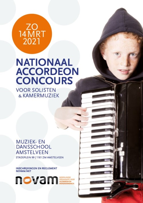 The 16th annual NOVAM (Nederlandse Organisatie voor Accordeon en Mondharmonica) National Accordion Competition for Soloists & Chamber Music will be held on March 14th, 2021 at the Amstelveen Music and Dance School in Amstelveen, Amsterdam, Netherlands.