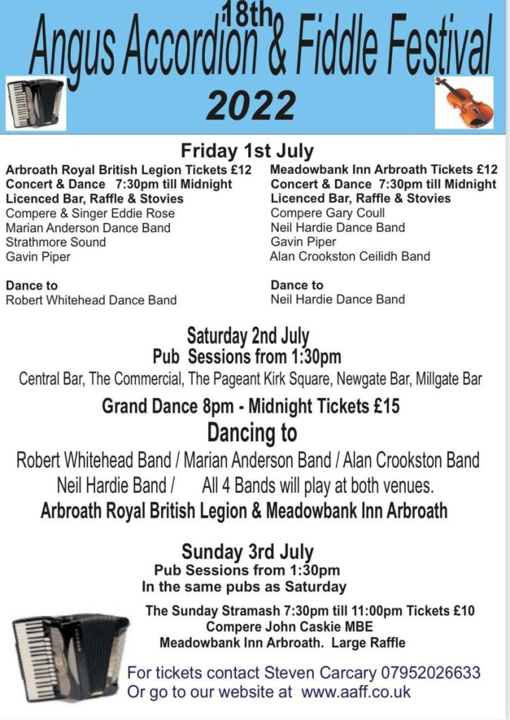 The 2022 18th Angus Accordion and Fiddle Festival will be held at a variety of venues in Angus, Scotland from July 1st to 3rd, 2022.