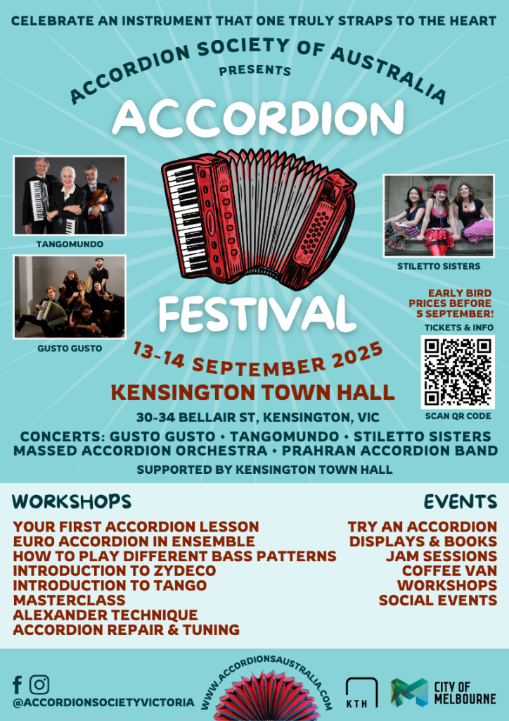 The Accordion Society of Australia (ASA Victoria) is thrilled to announce the 3rd Accordion Festival, a vibrant celebration of music, unity, and community. This year’s festival, which will be held on September 13th and 14th, 2025, promises to be an unforgettable experience, bringing together performers, players, and enthusiasts from all walks of life at the heritage-listed Kensington Town Hall in Kensington, Melbourne, Victoria, Australia.