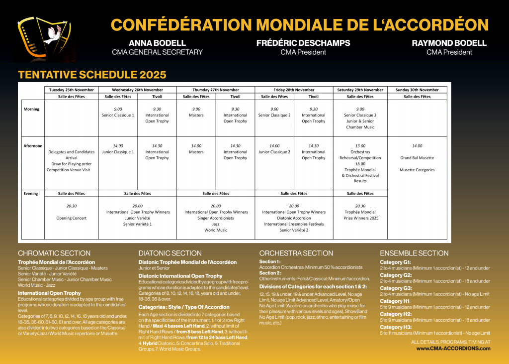 The 75th edition of the Trophée Mondial De L’accordéon 2025 will take place in Montargis. France from November 25th to December 1st, 2025.
