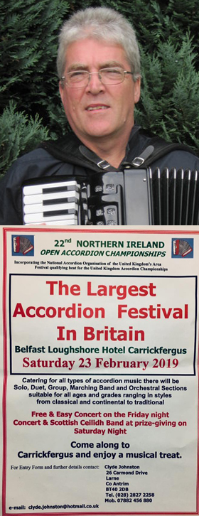 The 22nd annual Northern Ireland Open Accordion Championships are being held in the Loughshore Hotel, Carrickferus, Larne, on Saturday February 23rd 2019, running from 9 am to 5 pm. The organiser is local accordion teacher Clyde Johnston (picture right). Subject to entries and agreement with the competitors some sections may be held on the Sunday morning.