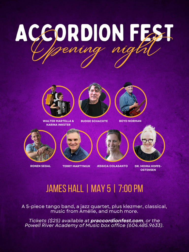 The 2nd Annual Powell River Accordion Festival will take place in Powell River, British Columbia, Canada on May 5th and 6th, 2023, directed by Walter Martella and Karina Inkster.