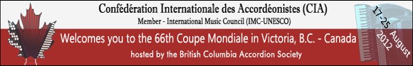 The Confédération Internationale des Accordéonistes (CIA) (IMC-UNESCO) held a very successful 66th Coupe Mondiale in Victoria, British Columbia from 17th to 25th August, 2013, hosted by the Canadian CIA member, the BC Accordion Society under the direction of 2013 CIA Honorary Vice President Aleksandar Milojevic.
