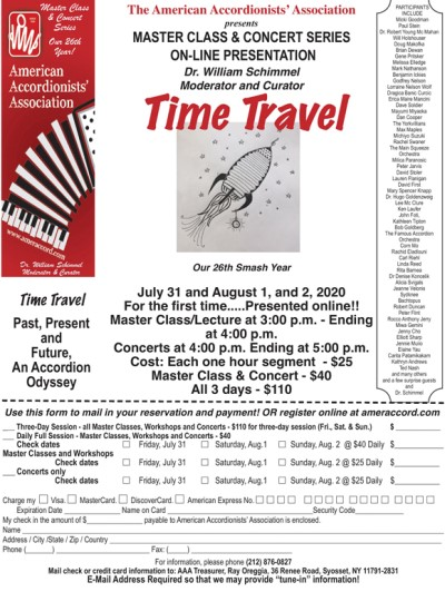 The American Accordionists’ Association (AAA) will present their 2020 Master Class & Concert Series with Dr William Schimmel (picture right), moderator and curator from July 31st to August 2nd, 2020. For the first time, this event will be presented online and will consist of 2 one-hour segments each day as follows: