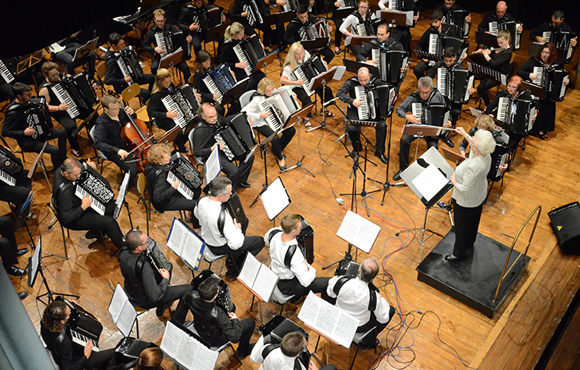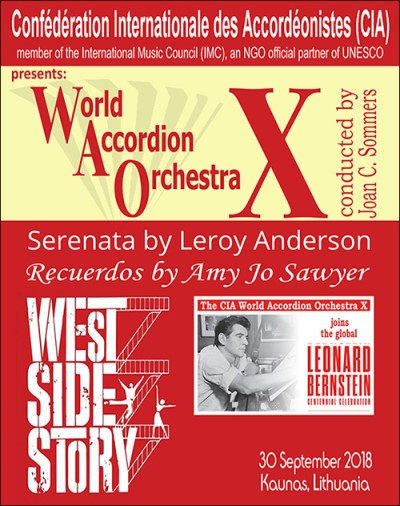 The World Accordion Orchestra X under the direction of Prof. Joan Sommers will perform three works: