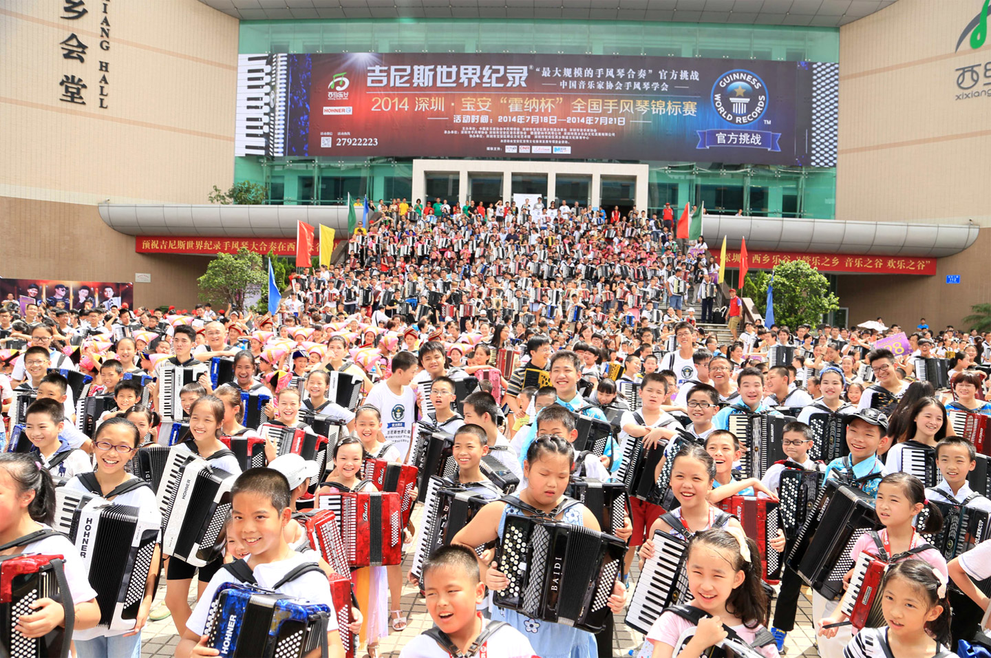 | Picture: Main entrance of Xixiang Music Valley where they also organised the Guinness World Record for Largest Accordion Ensemble was smashed on the morning of 20th July 2014 with a new record total of 1,361 accordionists all playing together. This photo is taken on the steps of the Shenzhen Xixiang Music Valley hall complex. The photo was taken from the Shenzhen Hengfeng Haiyue International Hotel which is right across the street from the Xixiang Music Valley hall complex. |