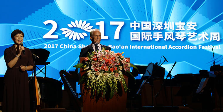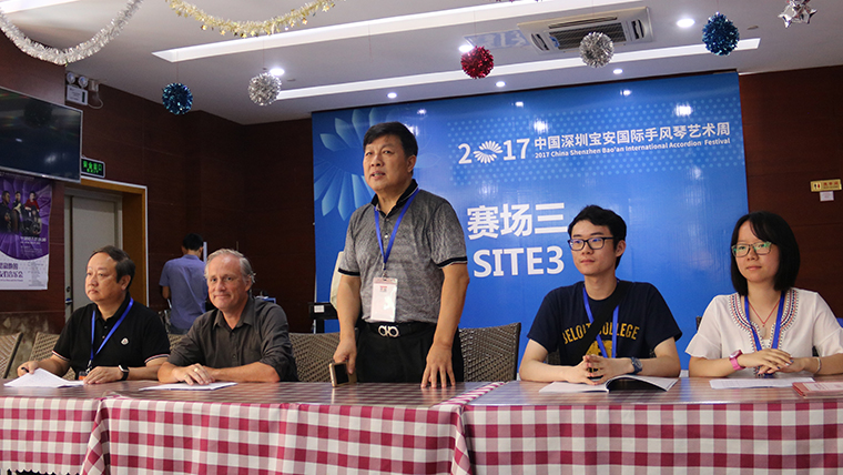 | Li Cong (President of the Chinese Accordion Association), Raymond Bodell (CIA President), Tong Jianhuua, (Managing Director of China Accordion Association of Chinese Musicians Association and President of the Shenzhen Accordion Association) and the translators welcoming the International guests and Jury members. | |