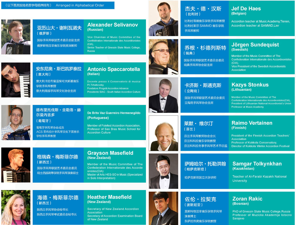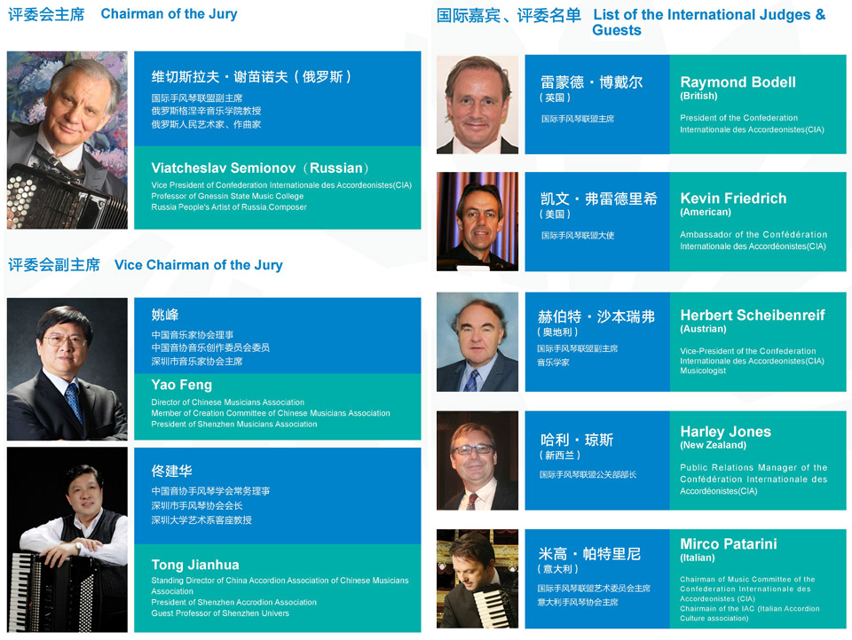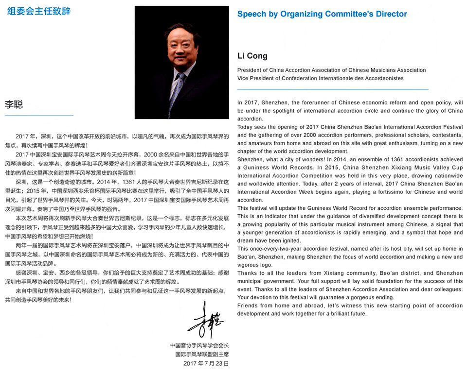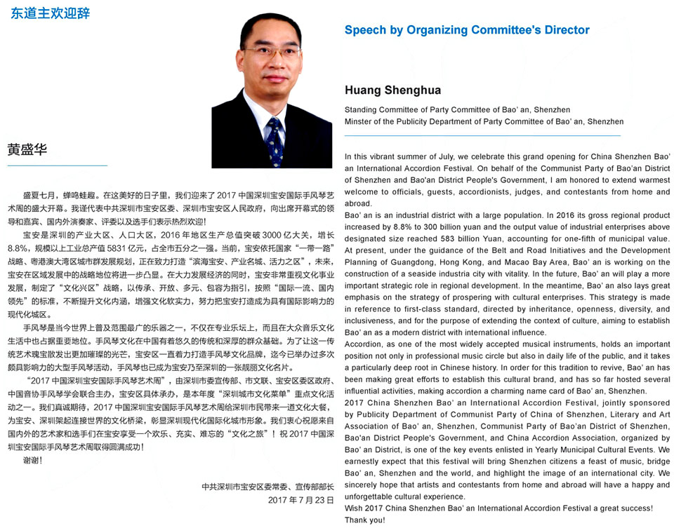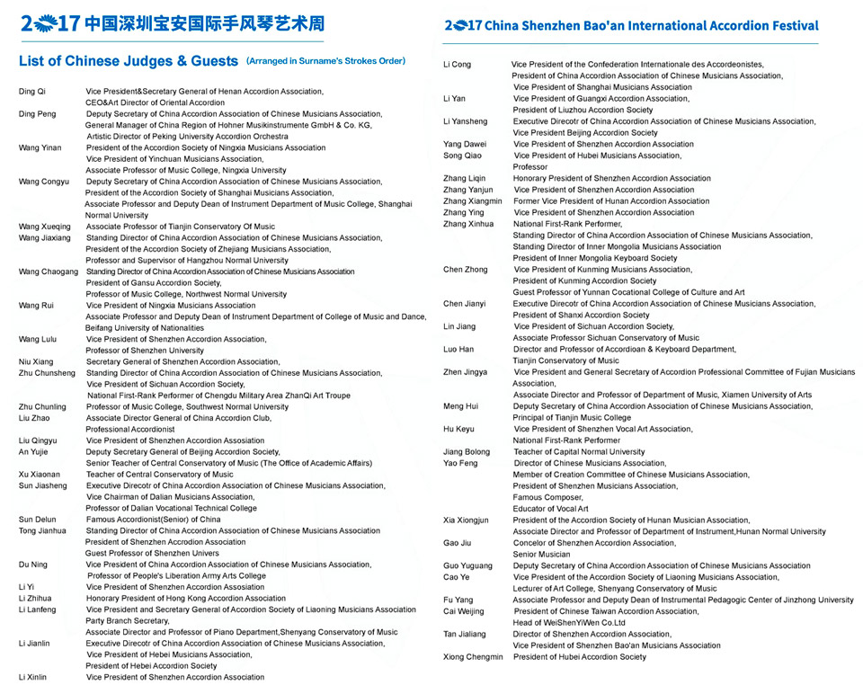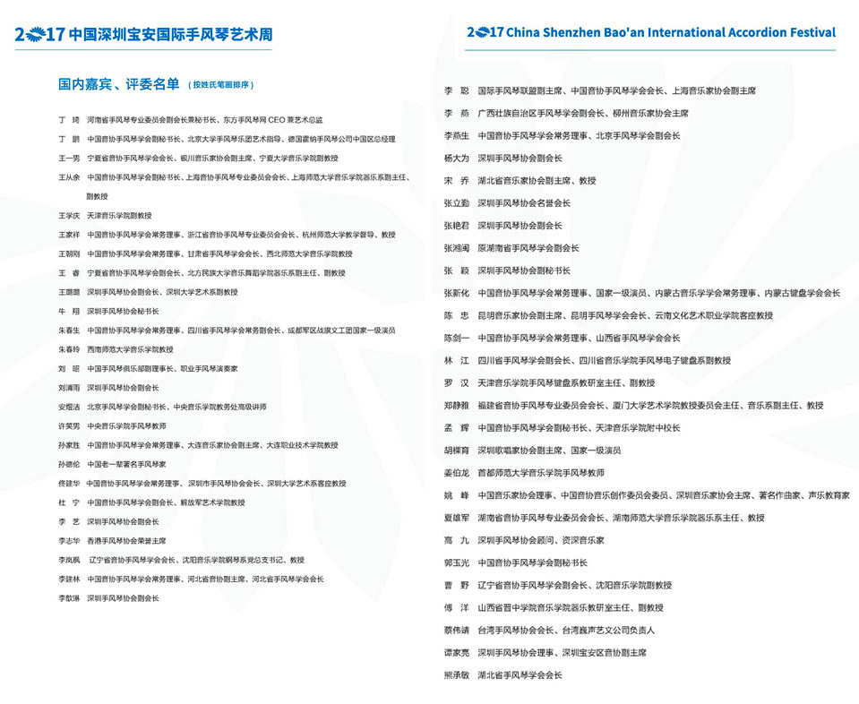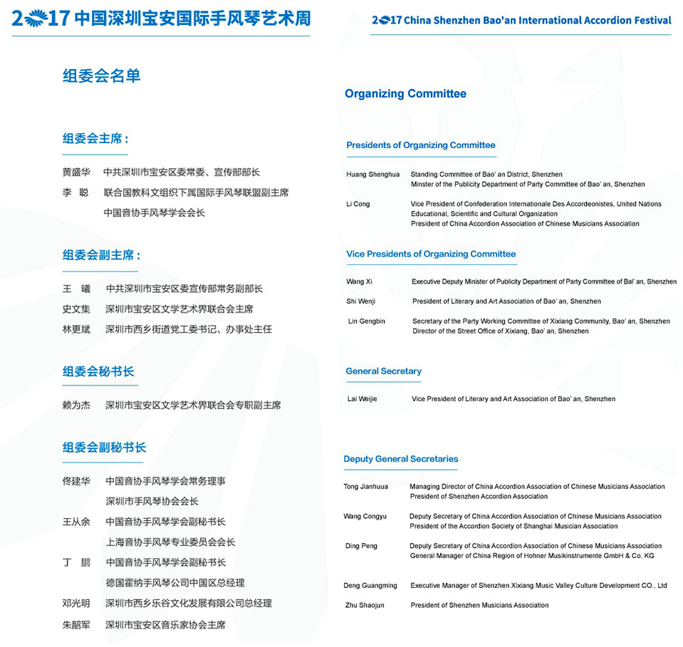 | The 2017 China Shenzhen Bao'an International Accordion Art Festival and Competitions will be the 2nd biannual international accordion competition and festival to be held in Shenzhen City. Organisers and Sponsors are: - Publicity Department of Communist Party of China of Shenzhen - China Accordion Association of Chinese Musicians Association - Bao'an District People's Government - Shenzhen Literary and Art Association |