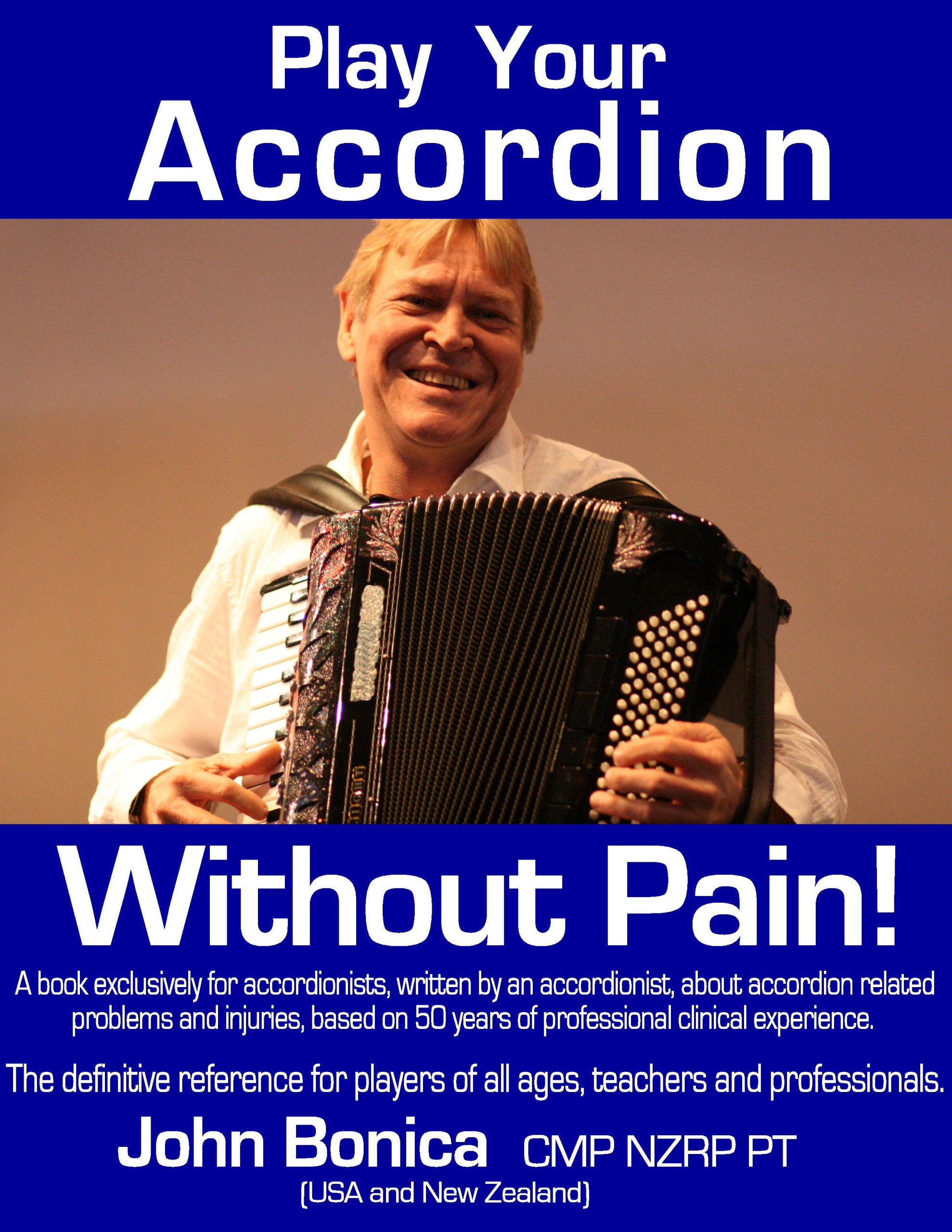 Read about the author John Bonica CMP NZRP PT (1942-2018) and find out why this eBook (delivered to you by download or email) has been described as: “The definitive reference for players of all ages, teachers and professionals.” Further information and/or order at: Play Your Accordion Without Pain US$18 less 20% or local currency equivalent.