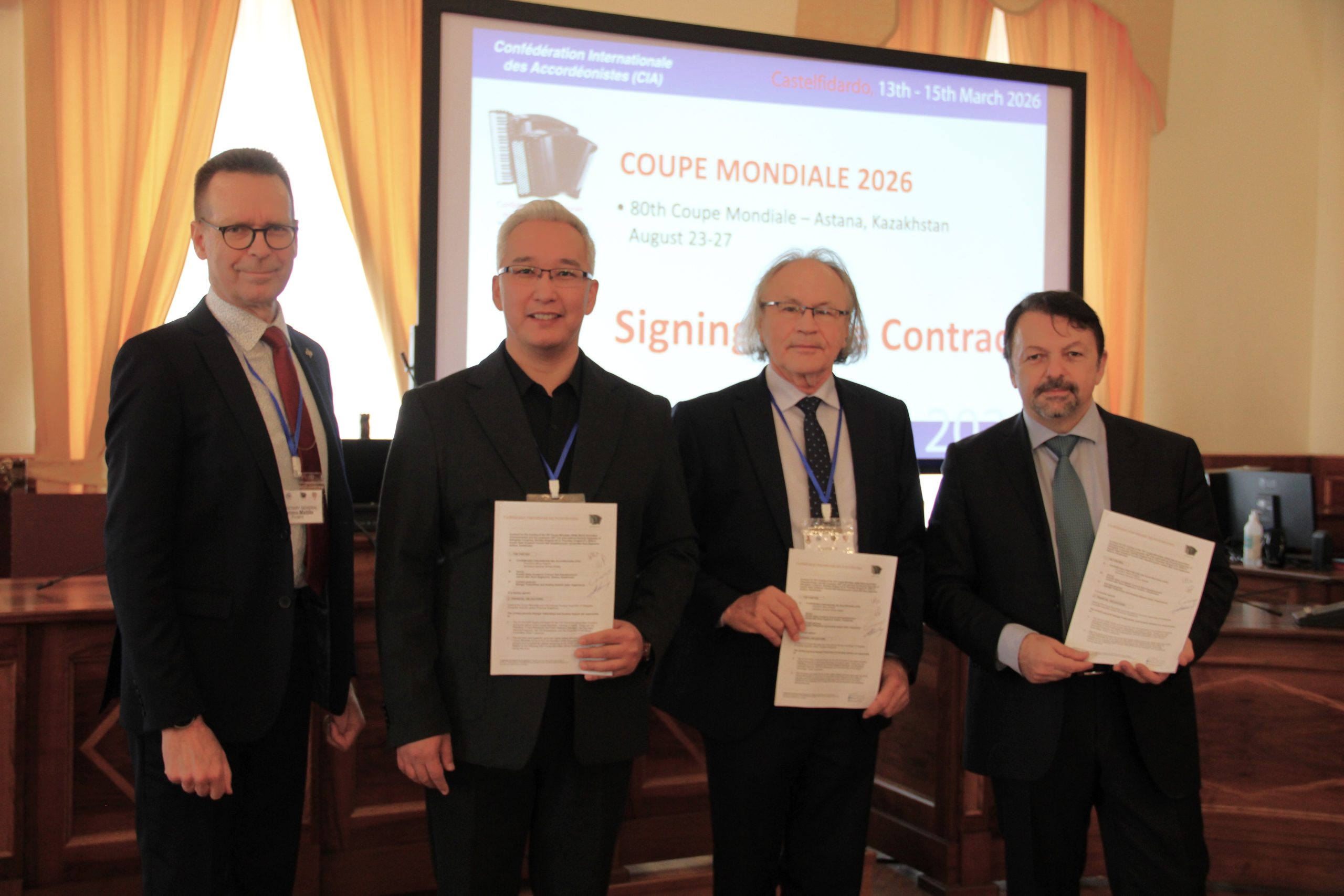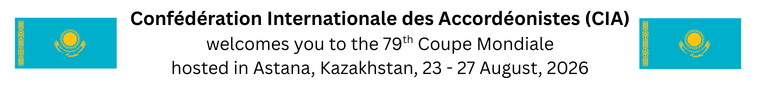 The 79th Coupe Mondiale will be hosted by the Kazakh Academic concert organisation “Qazaqconcert” from the 23 to 27 August, 2026 by CIA delegates Samgar Tolkynkhan and Anatoly Gaissin. It will be held at the Kazakh State Academic Concert Hall Kazakhconcert named after Roza Baglanova.