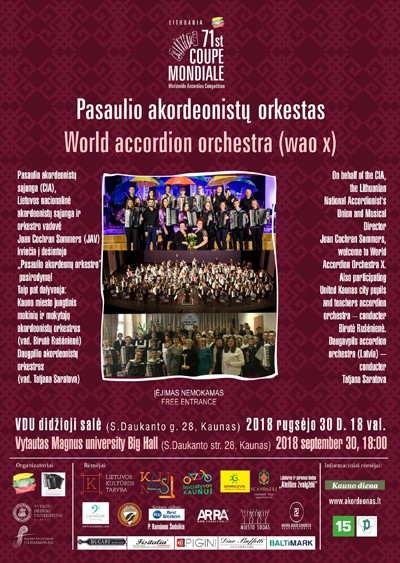 The Confédération Internationale des Accordéonistes 71st Coupe Mondiale hosted by the Lithuanian National Accordionist’s Union lead by President: Kazys Stonkus and Vice President: Mindaugas Labanauskas is ready to start.
