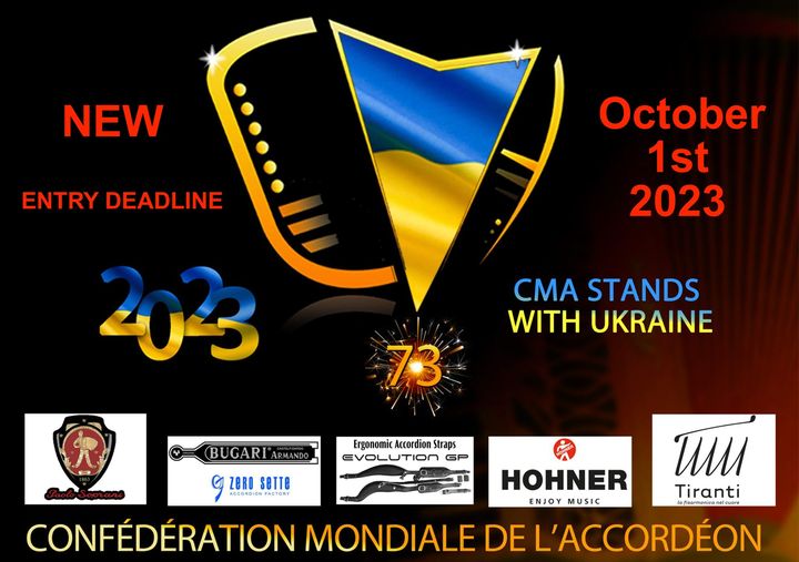 Frederic Deschamps has announced that the registration deadline and video recording deadline for CMA Online 2023 – Trophée Mondial De L’accordéon, Diatonic Accordion International Festival, International Accordion Orchestra & Ensemble Festival, has been extended to October 1st, 2023, due to many candidates traveling for other international events this month.