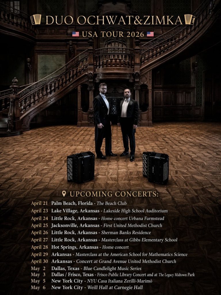 The accordion Duo Ochwat & Zimka (Poland) began a tour of the USA this week, performing in Palm Beach, Florida before travelling to Arkansas. They recently performed at the IBLA Prizewinners Concert, held at the Guri Art Hall in Seoul, South Korea alongside outstanding musicians from around the world.