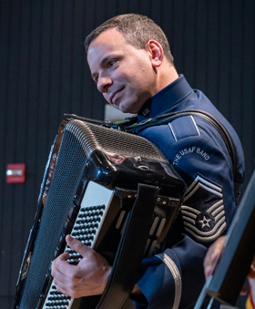 The Air Force Strolling Strings’ accordionist is Senior Master Sergeant Frank Busso, originally from Staten Island, New York, USA.