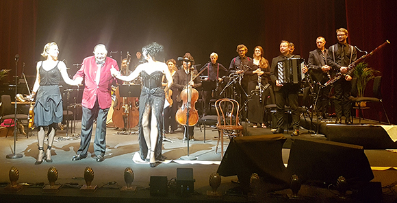 London based Ian Watson was the featured accordionist in the Aurora Orchestra during the popular show ‘Barry Humphries’ Weimar Cabaret’ which just concluded a month long engagement at the Barbican Center in London. Ian opened the show with Cabaret diva Meow Meow as the orchestra assembled on stage while renowned actor Barry Humphries served as the Emcee of the show which was a tribute to the jazz-infused music of the Weimar Republic.