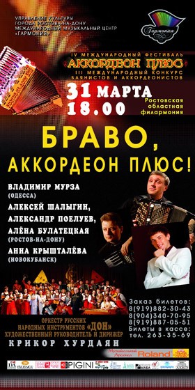 March 30th features composer Alexander Dorensky (Rostov-on-Don), and on March 31st is a concert titled “Bravo, Accordion Plus!” featuring Vladimir Murza (Odessa, Ukraine), AlexShalygin (Rostov-on-Don), Alexander Poeluev (Rostov-on-Don), and Laureats Grand Prix of Accordion Plus 2011 and 2012 Alain Bulatetskaya (Rostov-on-Don), Anna Kryshtaleva (Novokubansk) and the Russian folk orchestra “Don”, Artistic Director and Chief Conductor Krikor Hurdayan.