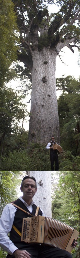 The beautiful two row Kauri instrument, rich in sonority and showcasing the gorgeous blond and precious Kauri wood wowed the audience and will now be proudly featured as the entrance exhibit in the Dargaville Museum which also houses the rare and permanent ‘Accordion Gems’ accordion exhibition. The oldest living Kauri Tree, Tane Mahuta (Lord of the Forest) is found just north of Dargaville and stands some 2,500 years old! Picture left with Kevin and the Kauri accordion – hard to believe Kevin is over 6 ft tall when you see him pictured with this huge ancient Kauri tree!
