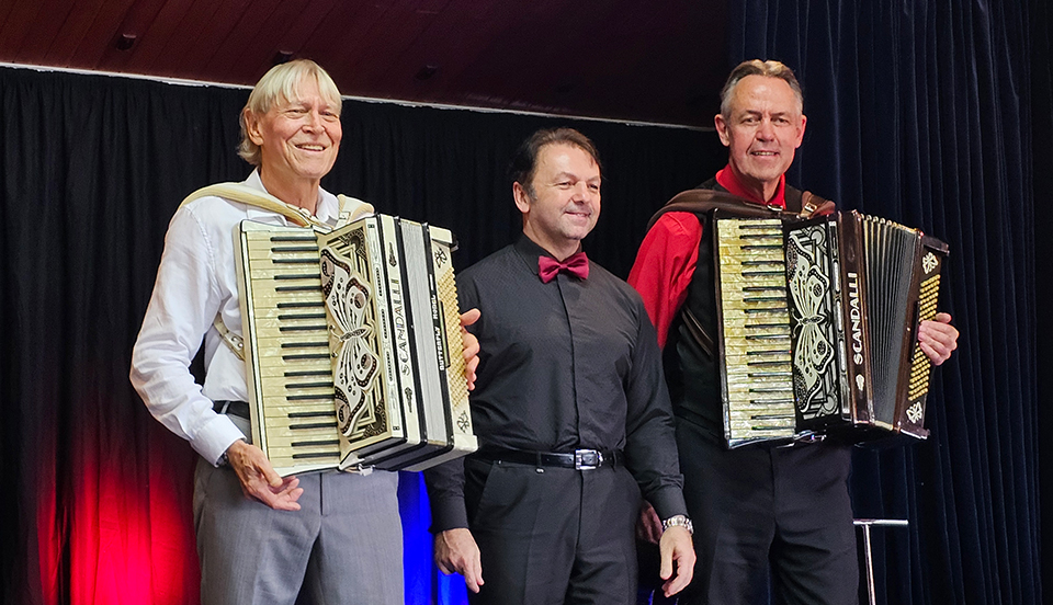 | The President of the Scandalli factory in Castelfidardo, Italy Mirco Patarini, with Maurice Jones and Kevin Friedrich with their Butterfly accordions! Mirco made a funny comment that while he was in New Zealand, he (a Scandalli artist) played on a Titano instrument and yet, the two Titano artists played on Scandalli instruments! At the conclusion of the performance, Maurice then donated his prize white mint condition Butterly to Kevin to go as a matching pair in his Accordion Gems exhbition. |