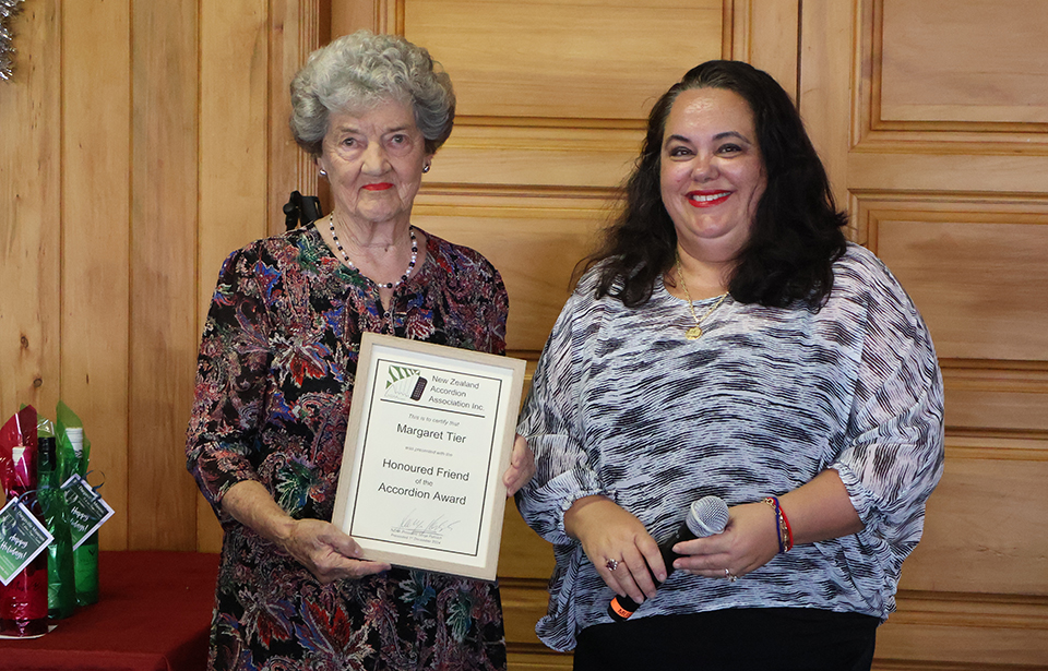 | Presentation by Sonja Palinich (NZAA President): NZAA Honored Friend of the Accordion - to Margaret Tier |