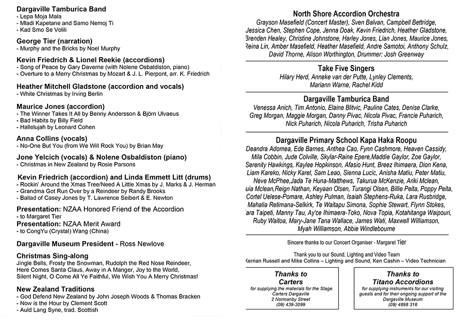 November 30 and December 1st saw the Dargaville Museum become the epicenter of accordion activities as dignitaries, performing artists and guests assembled from as far afield as Italy, China, the United Kingdom, Australia, the USA and across New Zealand. Hosted by Music Wing curator Kevin Friedrich, special guests attending and speaking at the Opening Ceremony of the updated and expanded Music Wing were Grant McCallum (Member of Parliament, Northland, National Party), Craig Jepson (Mayor of Kaipara District), Mirco Patarini from Italy (President of the Confédération Internationale des Accordéonistes, Member of the International Music Council, an Official NGO partner of UNESCO), Professor Li Cong from China (President - Accordion Association of Chinese Musicians Association and Vice President - Confédération internationale des Accordéonistes), Cong Yu (Crystal) Wang from China (Director - Accordion Professional Comm., Shanghai Musicians Assoc., Dean – Dept. of Western Music at Shanghai Normal University), Marcel Riethmann (Chairman of the Accordion Examination Board of New Zealand), Sonja Palinich (President of the New Zealand Accordion Association), Ross Newlove (President of the Dargaville Museum). Speeches were alternated with a spectacular variety of musical items. After the ribbon cutting attendees were piped up to the Music Wing for the official blessing given by Rex Nathan followed by a champagne reception and music wing tour. The day capped off with a fundraising dinner at the Northern Wairoa Hotel where guests dined to a variety of entertainment including some dance sets after the dinner. The dinner held in honor of the 150th anniversary of the Aratapu Library (1874), the funds raised were directed to the new LED lighting in the display cabinets. Sunday saw the 19th Museum fundraiser ‘An Afternoon of Music with Kevin Friedrich and Friends. The popular sold out concert featured guests from overseas as well as local stars including a set by world champion accordionist Grayson Masefield and violinist Andrew Beer (concert master of the Auckland Philharmonia), the 50 strong Kapa Haka Roopu from the Dargaville Primary School, a 22 piece North Shore Accordion Orchestra from Auckland conducted by renowned New Zealand composer Gary Daverne, a Dargaville favorite Lionel Reekie and an array of other talented local and invited guest artists. For Kevin’s concert he asked the Daragaville Primary School Kapa Haka Roopu to include Tutira Mai nga Iwi as one of their items, as it also served as a theme song for the All Blacks campaign. |