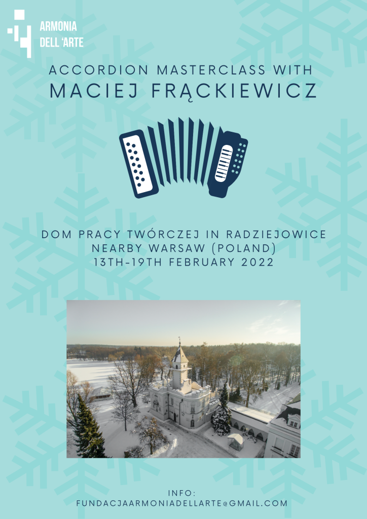 Dr Maciej Frackiewicz will hold an Accordion Masterclass at Dom Pracy Tworczej (Palace) in Radziejowice near Warsaw, Poland from February 13th to 19th, 2022.