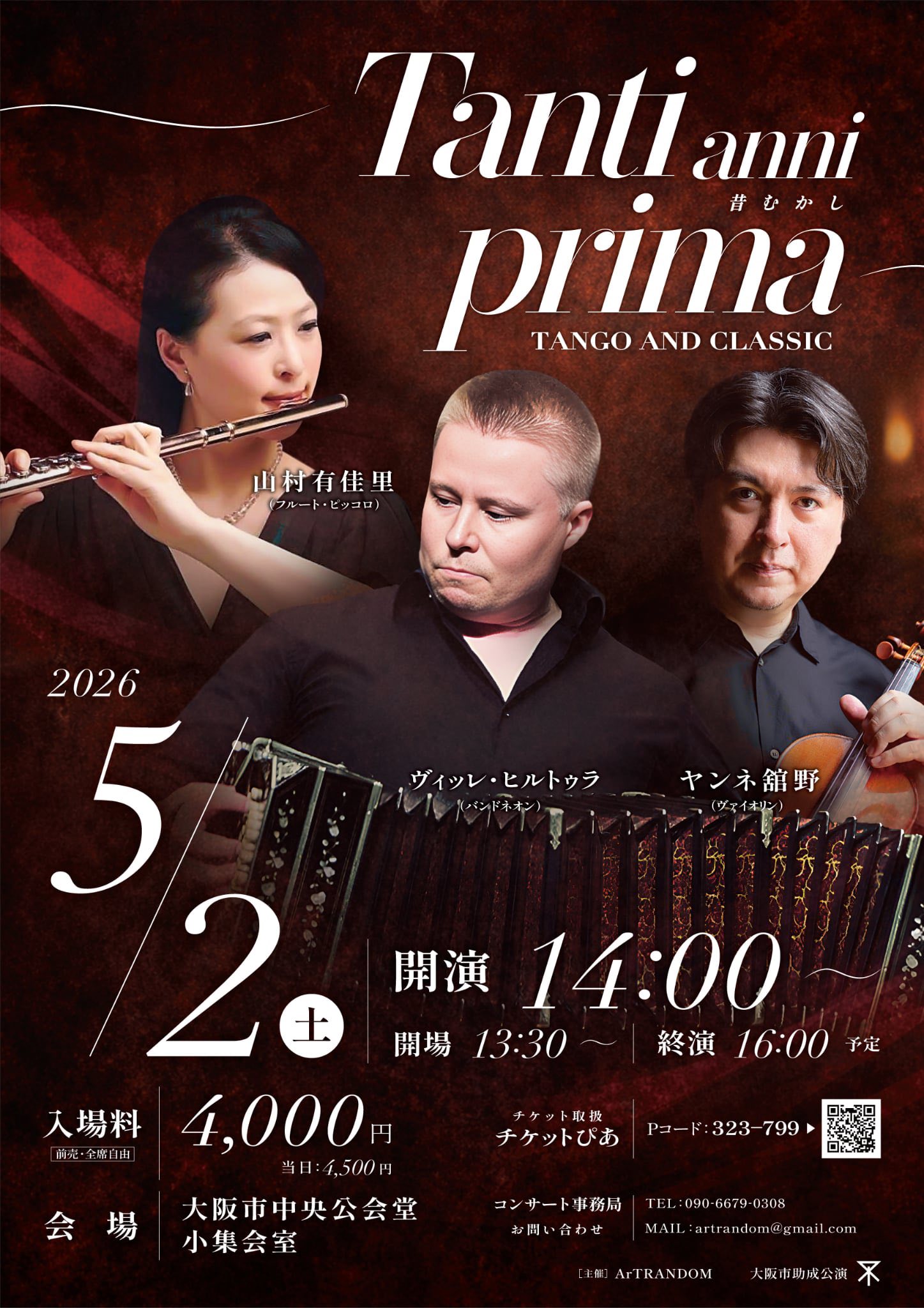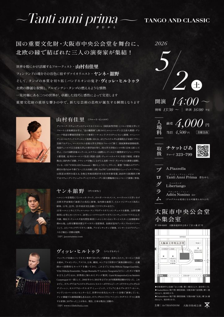 A Tango & Classic Concert will be held at the Osaka City Central Public Hall Small Meeting Room in Nakajima, Osaka, Japan on May 2nd, 2026 from 2pm.