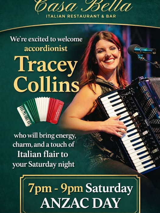 Accordionist Tracey Collins will bring “energy, charm, and a touch of Italian flair” to the Casa Bella Italian Restaurant & bar in Auckland, New Zealand on April 25th, 2026 from 7pm to 9pm.