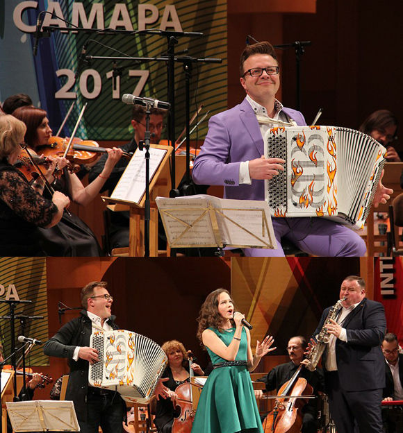 The final day of the festival included a concert of prize winners and an evening concert by the very popular Sergey Voitenko and “Bayan Mix” (pictures above and below) in the Samara Philharmonic Hall to a full audience, where Sergey performed his new compositions with chamber ensemble and jazz group.