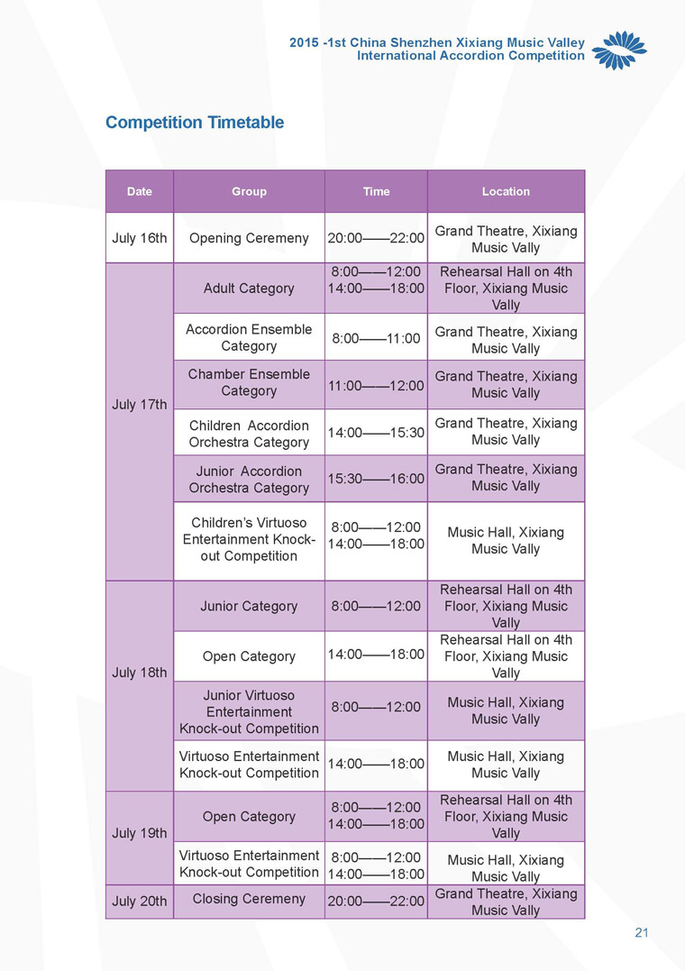 | 9:30 - 17:30 | International Judges, Guests, Concert Performers, Registration | Hengfeng Haiyue International Hotel Lobby, Address: Metro Plaza, Eighty Area, Bao'an District, Shenzhen |